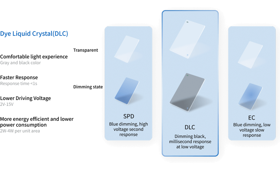 Dye liquid crystals with dichroic properties are injected between two layers of glass or plastic substrates coated with transparent conductive oxides to form a liquid crystal dimming functional layer, and the rotational angle of the liquid crystals and dye molecules can be adjusted by applying an AC voltage (<24V) to control the luminous flux of the window and realize the delicate control of the glass light transmittance.